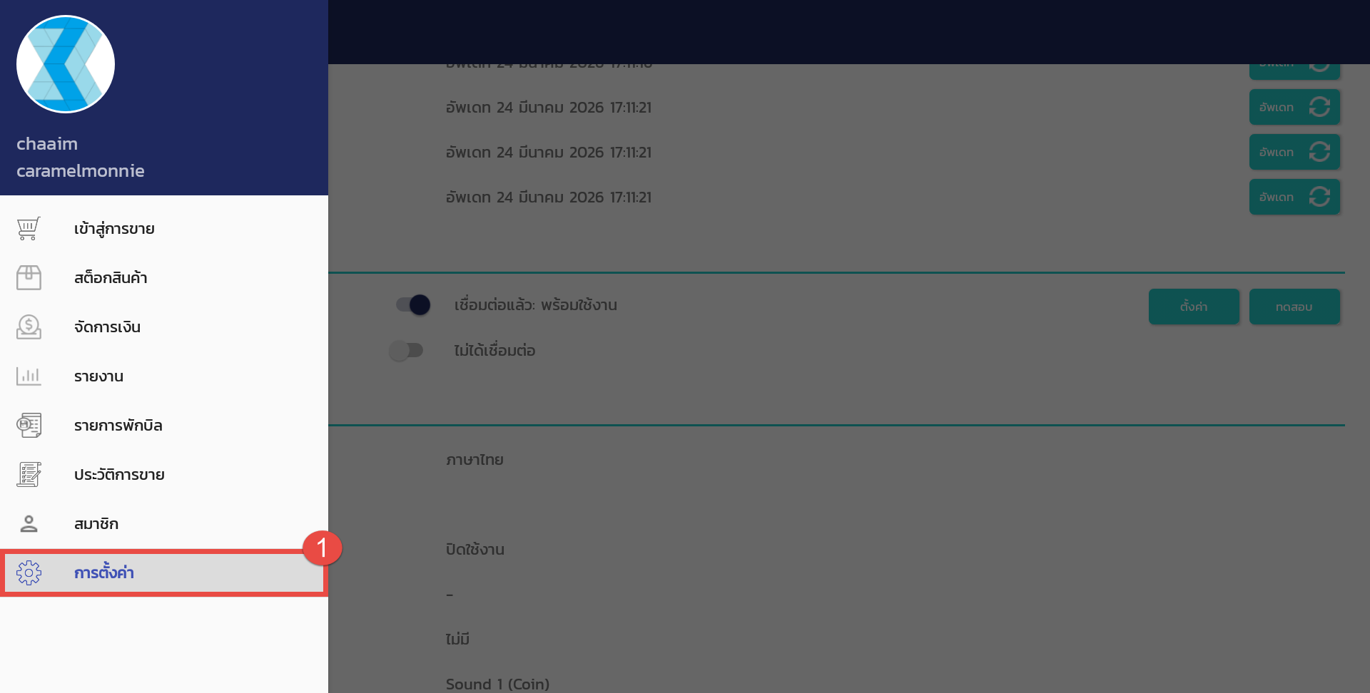 1. เข้าสู่ระบบApp POS แล้วไปที่เมนู “ตั้งค่า”