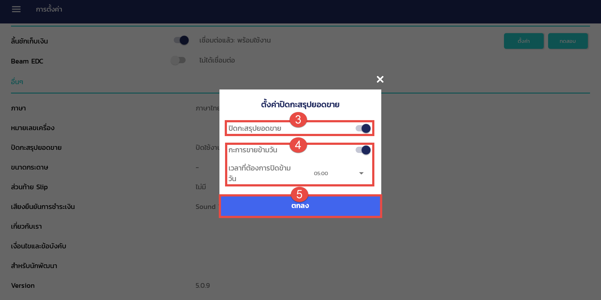 3. กดเปิดการใช้งานในหัวข้อ “ปิดกะสรุปยอดขาย” (กรณีร้านค้ายังไม่ได้ปิดยอดการขายรายวัน ระบบจะมีแจ้งเตือนให้ปิดกะในเวลา 00.01 น.)