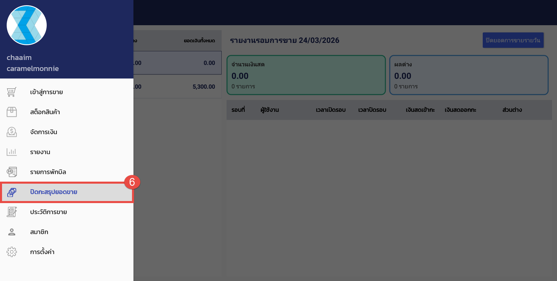 6. ระบบจะเพิ่มเมนู “ปิดกะสรุปยอดขาย” ขึ้นมาให้ โดยร้านค้าสามารถดูข้อมูลรายงานตามรอบการขาย ปิดกะและพิมพ์รายงานจากเมนูนี้ได้