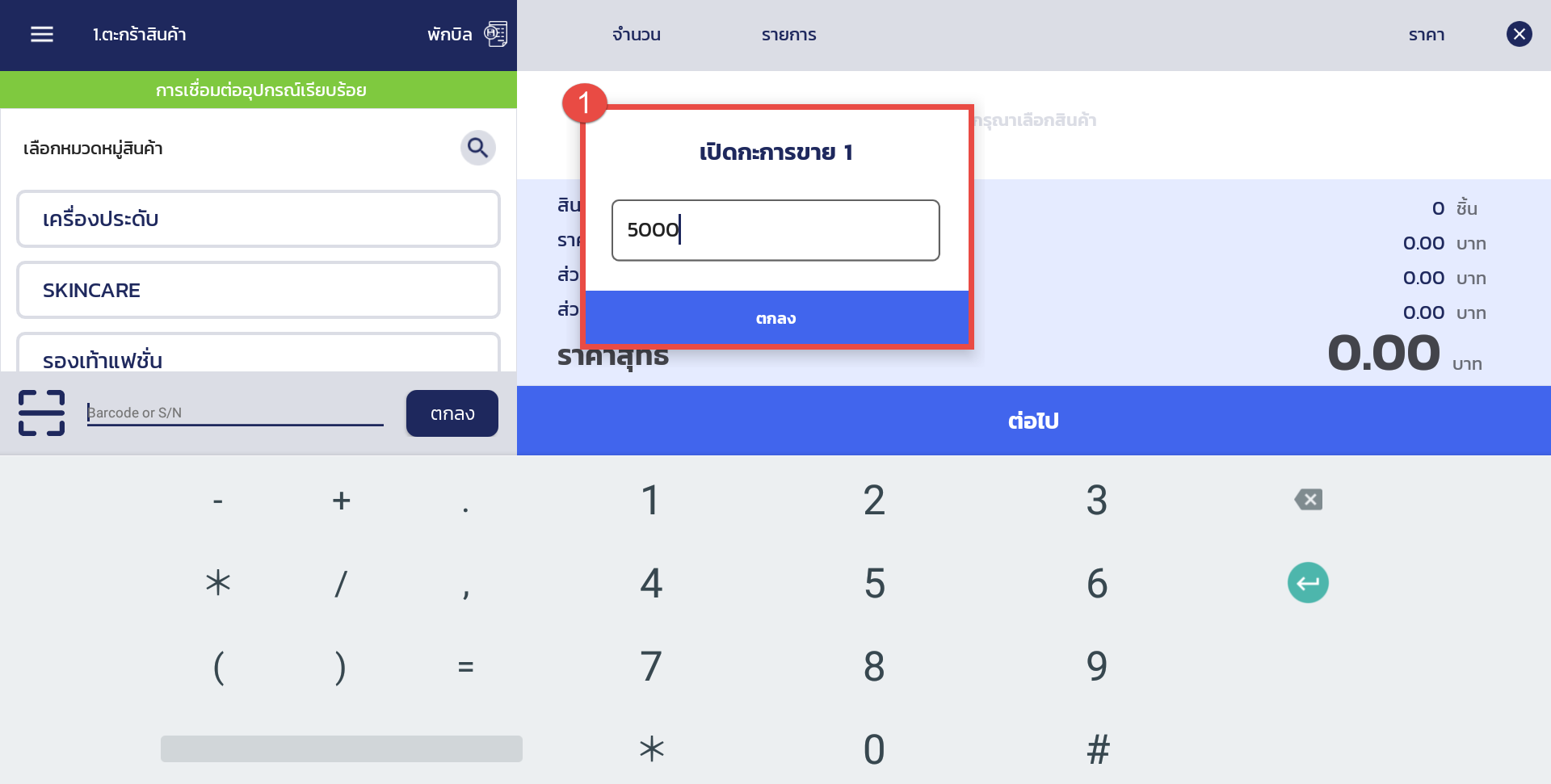 1. เมื่อร้านค้าเข้าสู่ระบบ App POS เรียบร้อยแล้ว ระบบจะแสดง Pop-up สำหรับกรอกจำนวนเงินในลิ้นชักตามกะนั้น ๆ ซึ่งร้านค้าสามารถสร้างรายการขายได้ตามปกติ