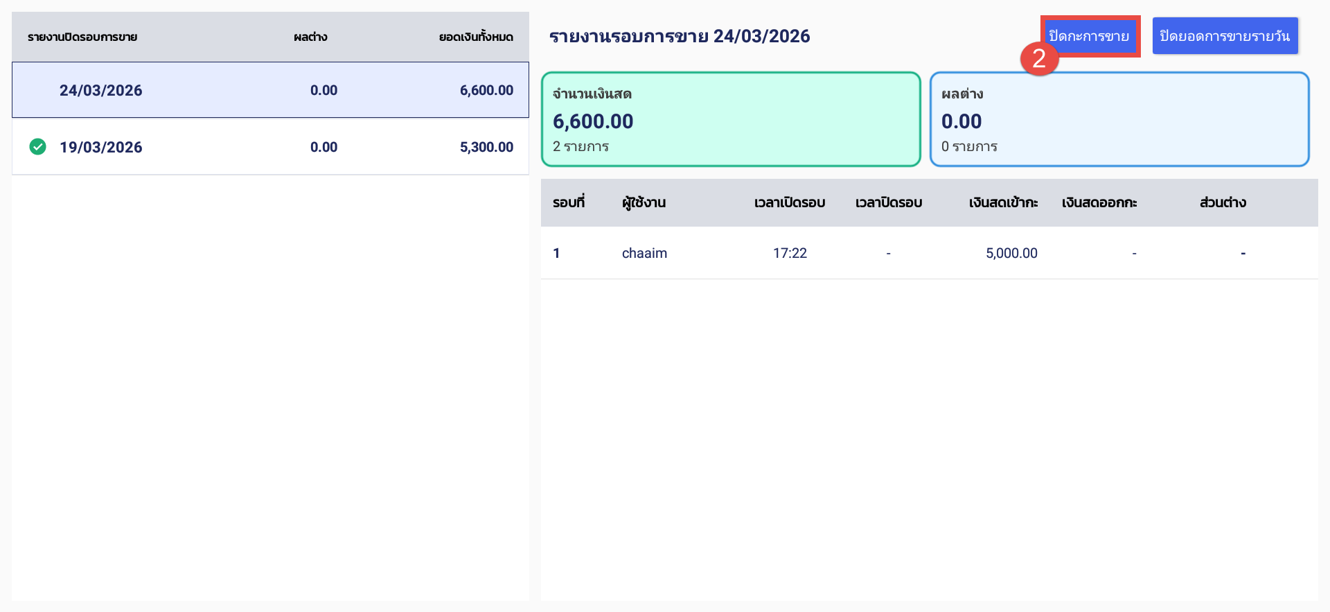2. หลังจากจบกะนั้น ๆ แล้ว พนักงานสามารถกดปุ่ม “ปิดกะการขาย” เพื่อสรุปยอดขายของกะตนเองได้