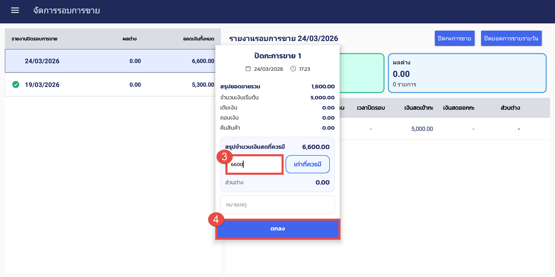 3.ระบบจะแสดงPop-up รายงานยอดขายของกะนั้น ๆ ขึ้นมาให้ จากนั้นให้พนักงานกรอกจำนวนเงินที่มีอยู่ในลิ้นชัก