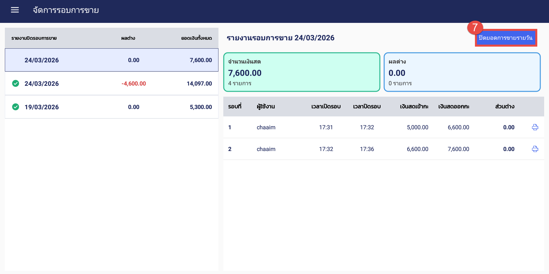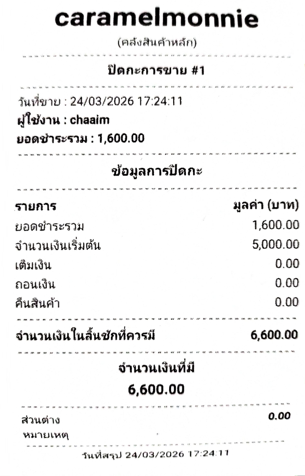 5. เมื่อปิดกะเรียบร้อยแล้ว ระบบจะแสดงรายงานสรุปยอดขายของกะนั้น ๆ ขึ้นมาให้ โดยพนักงานสามารถกดพิมพ์เอกสารได้