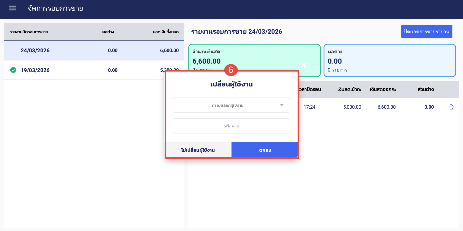 6. หลังจากปิดกะเรียบร้อยแล้ว ระบบจะแสดง Pop-up เปลี่ยนผู้ใช้งานขึ้นมาให้ พนักงานกะถัดไปสามารถเลือกอีเมลและกรอกรหัสผ่านเพื่อใช้งานเครื่องต่อได้ กรณีพนักงานใช้อีเมลเดียวกันให้กดปุ่ม “ไม่เปลี่ยนผู้ใช้งาน”