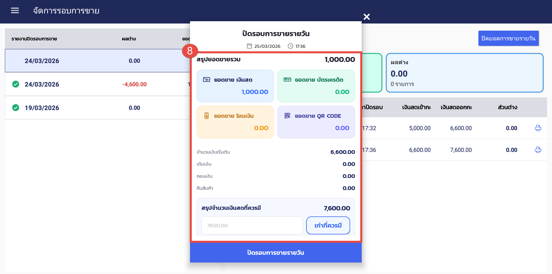 8. ระบบจะแสดง Pop-up สรุปยอดขายทั้งหมดในวันนั้น ๆ และจำนวนเงินในลิ้นชักขึ้นมาให้ตามตัวอย่าง