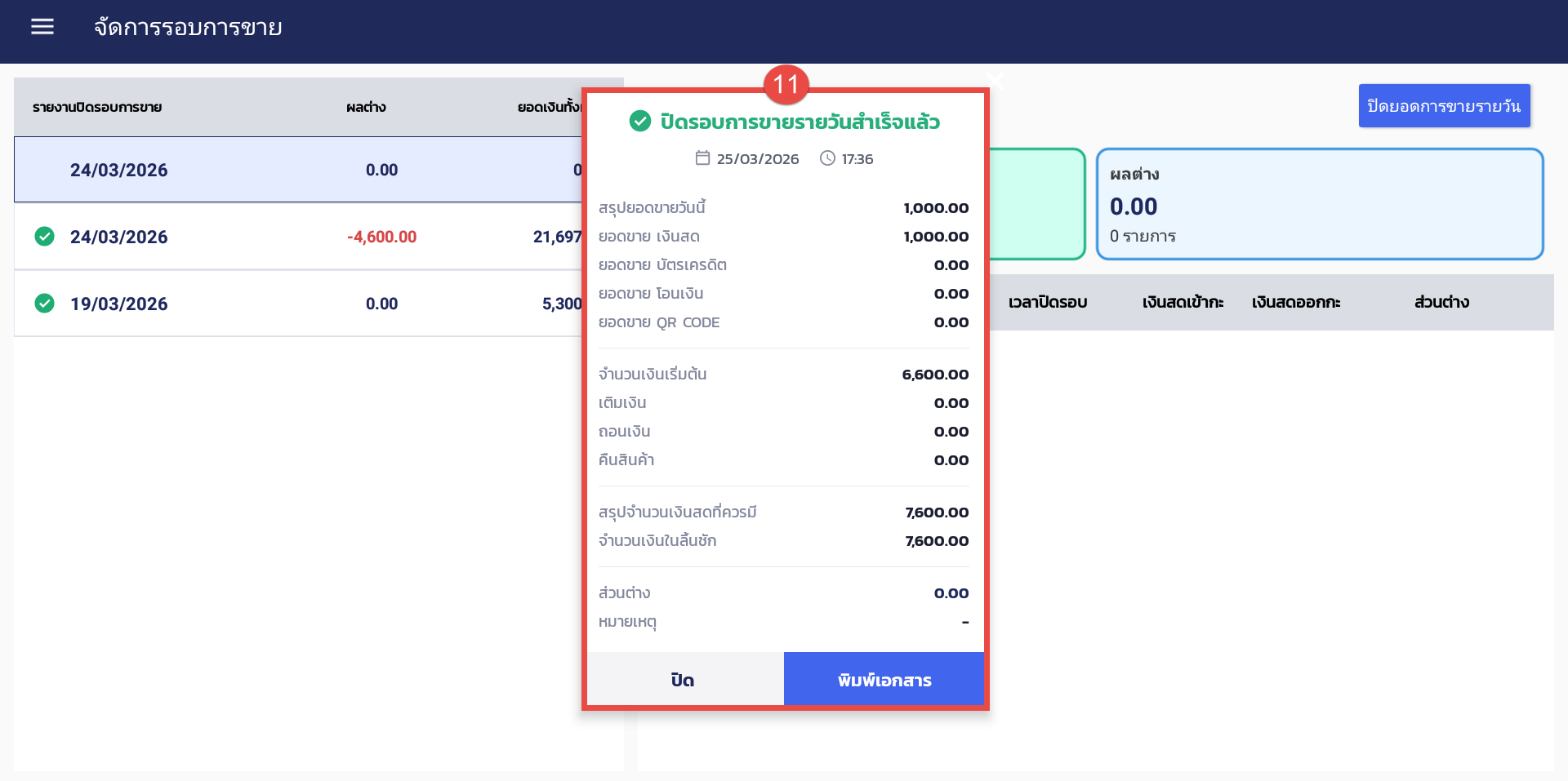 11. ระบบจะแสดงรายงานสรุปยอดต่าง ๆ ขึ้นมาให้ โดยร้านค้าสามารถพิมพ์เอกสารได้ (รอบการขายใดที่มีการปิดกะเรียบร้อยแล้ว ระบบจะแสดงเครื่องหมายถูกให้ด้านหน้าวันที่ของรายการนั้น ๆ)