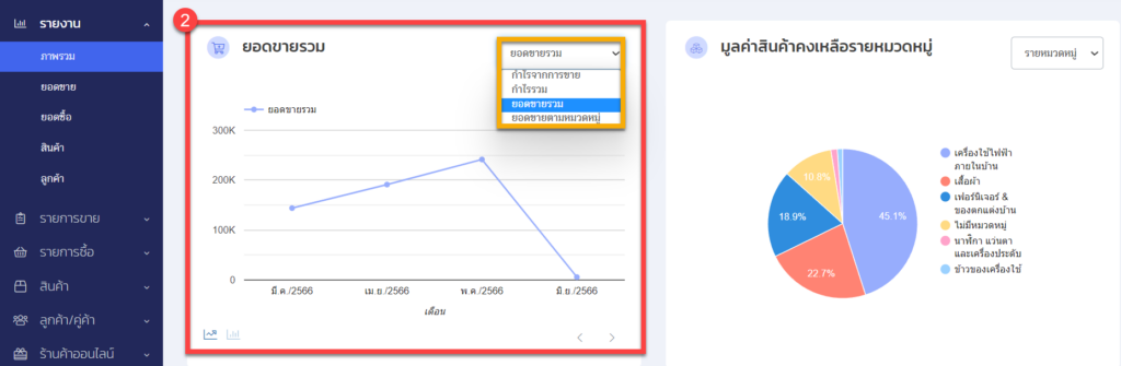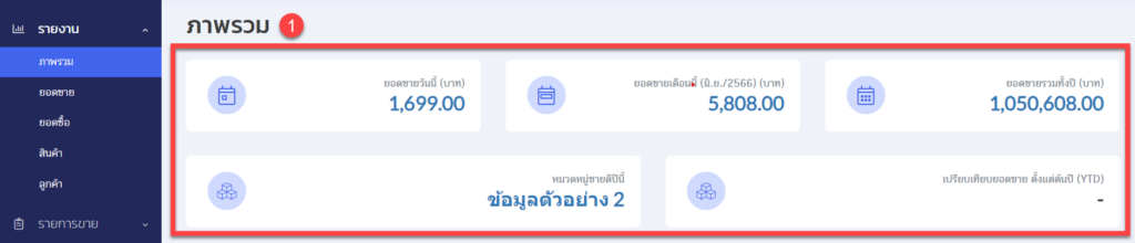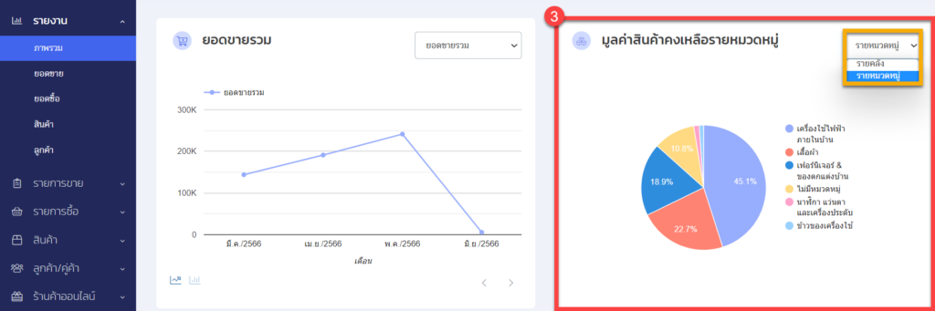 ในส่วนนี้จะช่วยให้คุณสามารถที่จะดูได้ว่าในช่วงเวลาปัจจุบันนี้ ร้านค้าของคุณทำยอดขายได้มากน้อยเพียงใด และหมวดหมู่ไหนที่ขายดีที่สุด