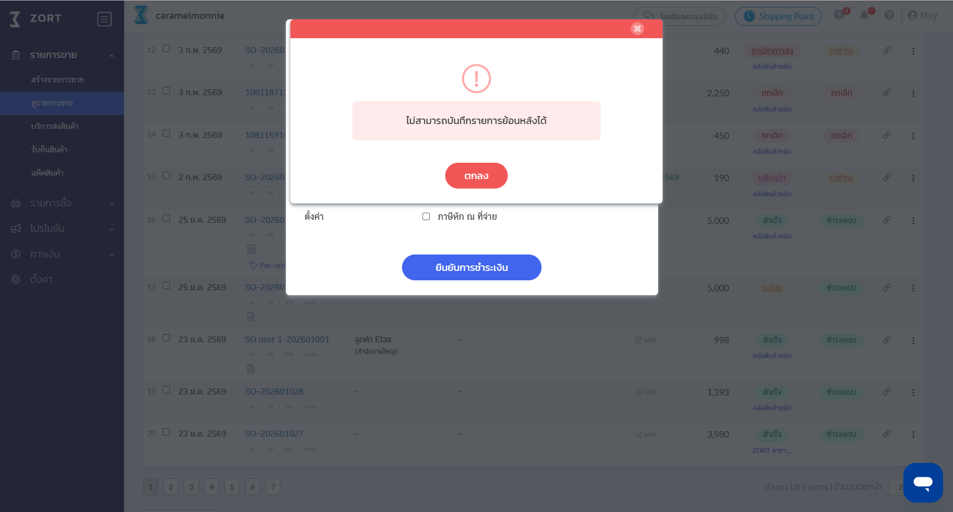 8. เมื่อสิทธิ์การใช้งานนั้น ๆ กดบันทึกการชำระเงินในรายการซื้อรายการขาย/ รายการคืนสินค้า รายการรับคืนสินค้า รายได้อื่น และรายจ่ายอื่น ระบบจะไม่อนุญาตให้บันทึกการชำระเงินย้อนหลัง