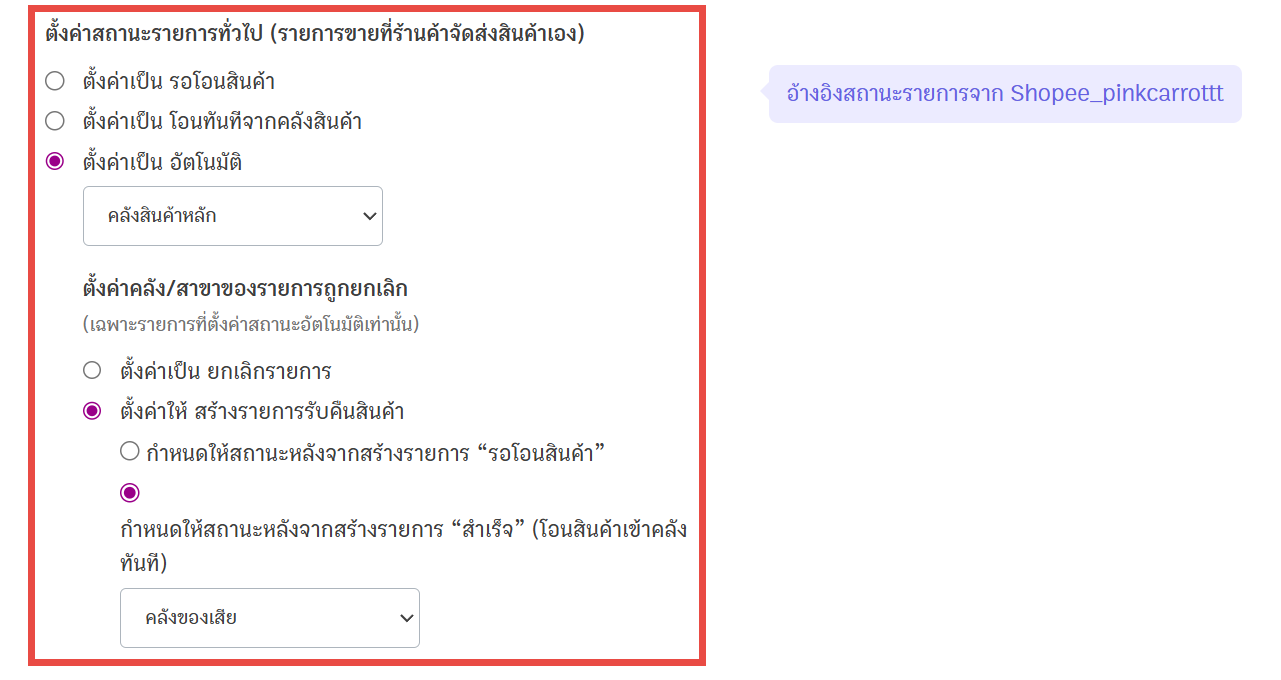 - ตั้งค่าเป็นอัตโนมัติ : สถานะรายการขายจะอ้างอิงจาก shopee เช่น เมื่อมีการกดเรียกขนส่ง จะเปลี่ยนสถานะจาก “รอโอน” เป็น “รอส่ง” อัตโนมัติ ทำให้ทางร้านค้าไม่ต้องปรับสถานะเอง