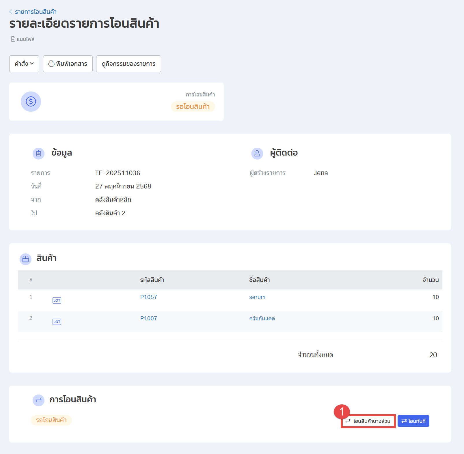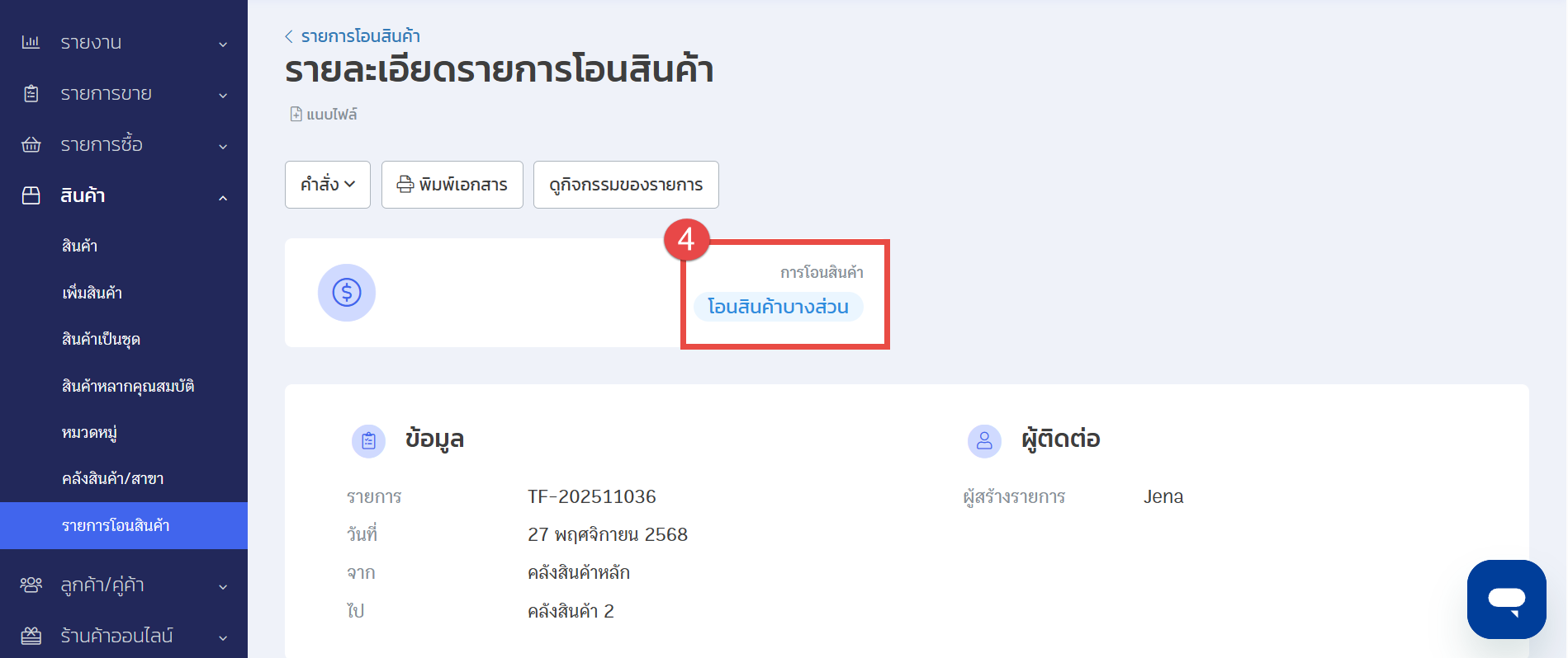 1. เมื่อร้านค้าสร้างรายการโอนสินค้าเรียบร้อยแล้ว ให้คลิกที่ปุ่ม “โอนสินค้าบางส่วน”