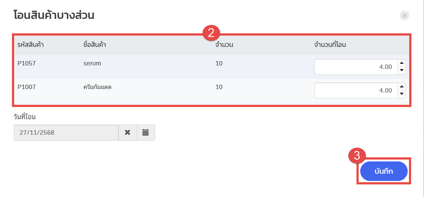 - จำนวน : ใส่จำนวนสินค้าที่ต้องการโอน