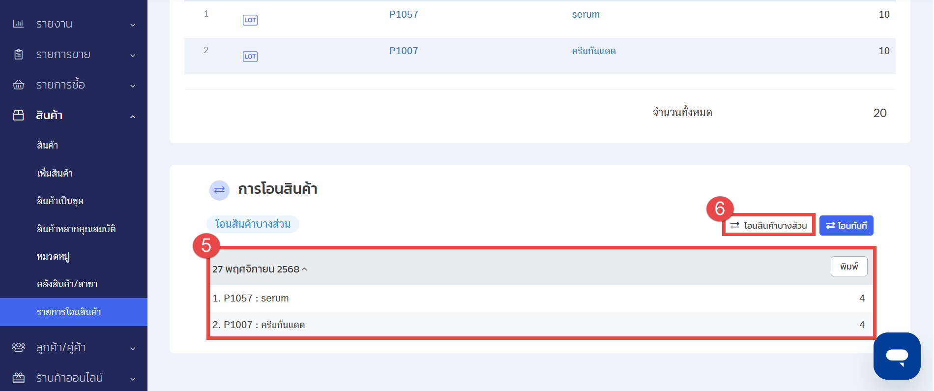 6. กรณีร้านค้าต้องการโอนสินค้าในรอบถัดไป ให้คลิกที่ปุ่ม “โอนสินค้าบางส่วน” และทำตามขั้นตอนเดิมได้เลย