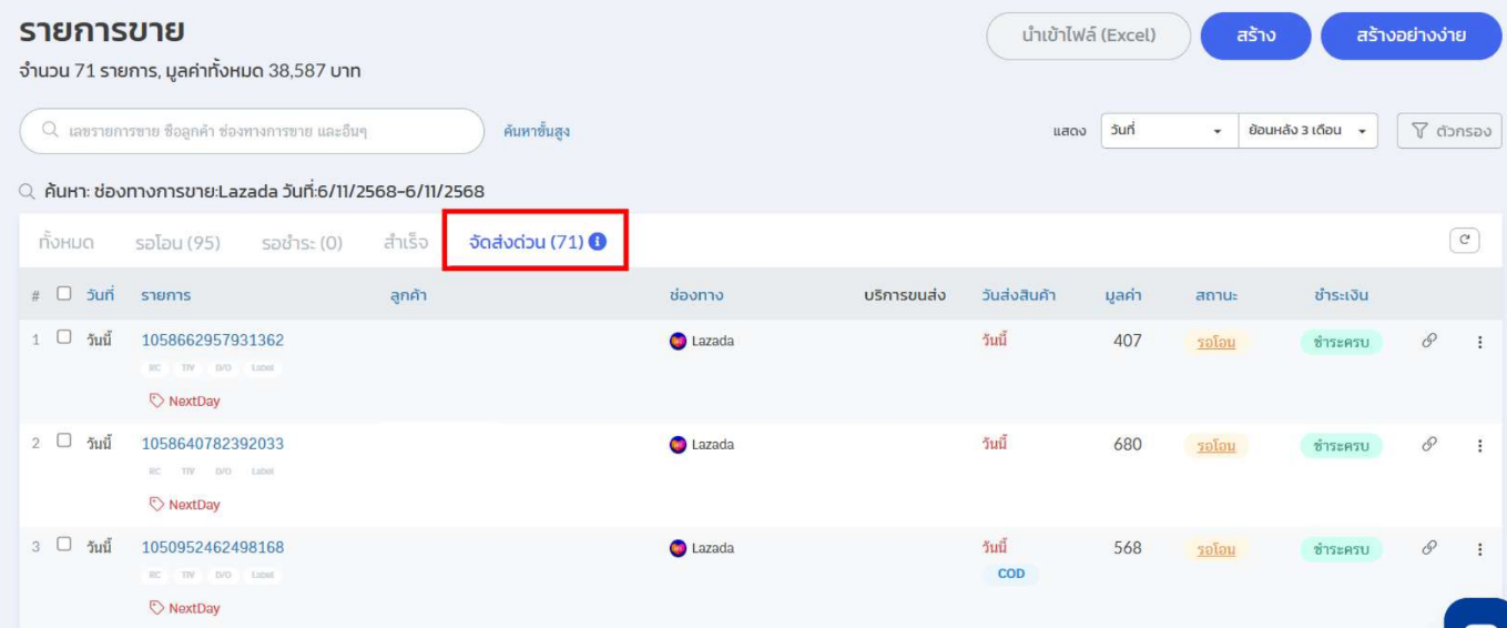 2. จากนั้นไปที่แท็บสถานะ “จัดส่งด่วน”