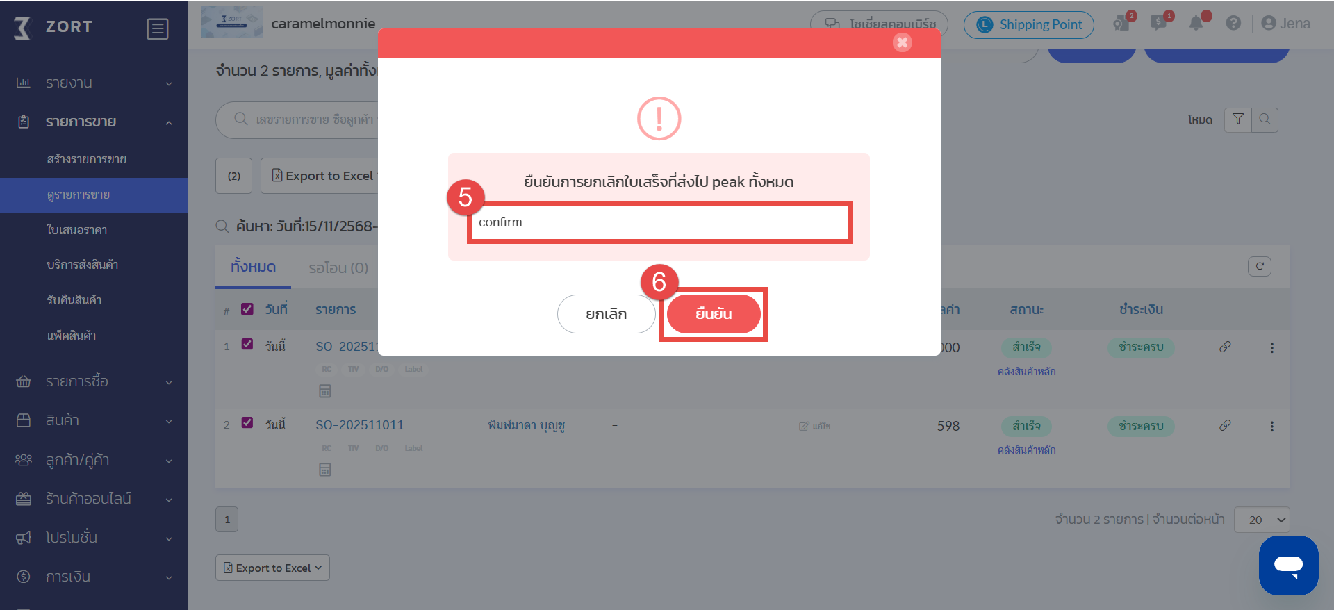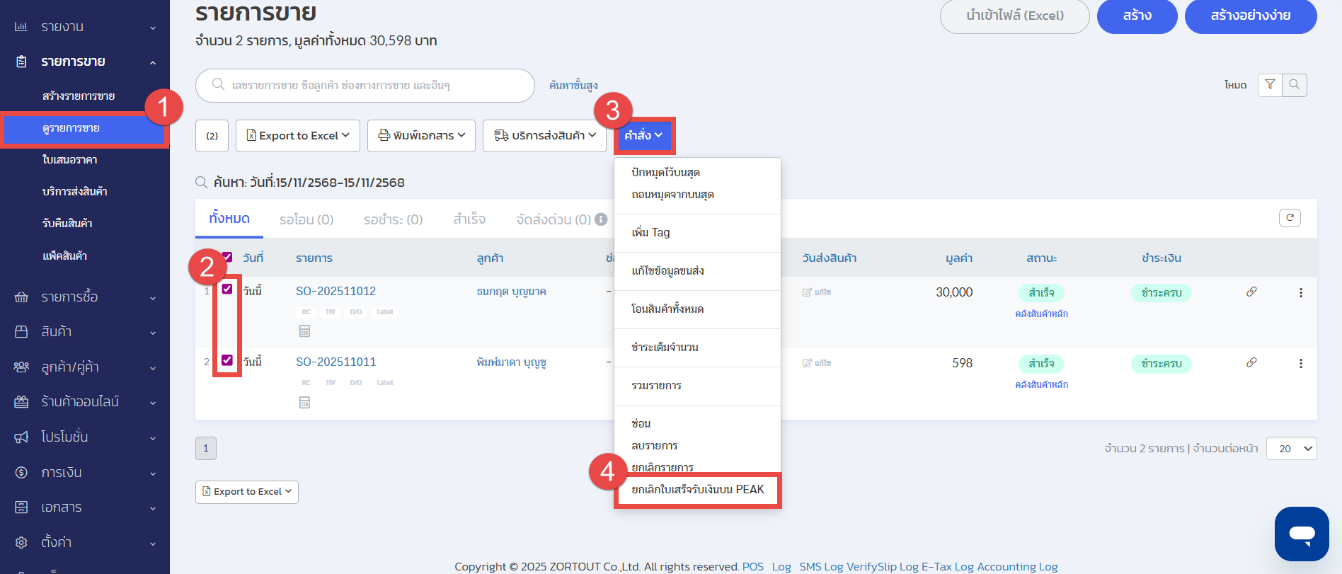2) กรณีร้านค้ากดยกเลิกเอกสารที่ PEAK แล้ว จะไม่สามารถกดยกเลิกเอกสารบน ZORT ได้