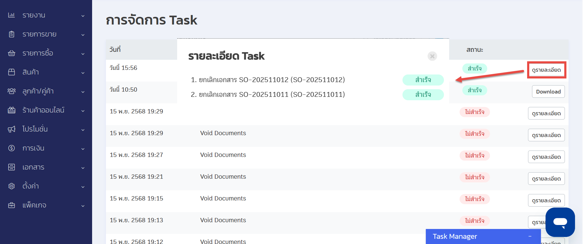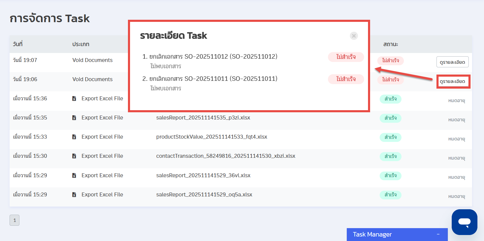 เมื่อผู้ใช้งานกดยกเลิกเอกสารเรียบร้อยแล้ว ระบบจะแสดง Log ยกเลิกเอกสารที่ Task Manager โดยระบบจะแบ่งออกเป็น 2 กรณี คือ
