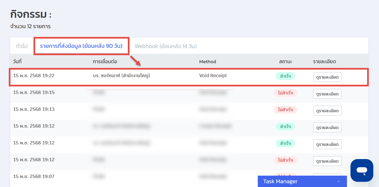 จากนั้นเลือกแท็บรายการที่ส่งข้อมูล (ย้อนหลัง 90 วัน)ระบบจะแสดง Log ขึ้นมาให้ตามตัวอย่าง