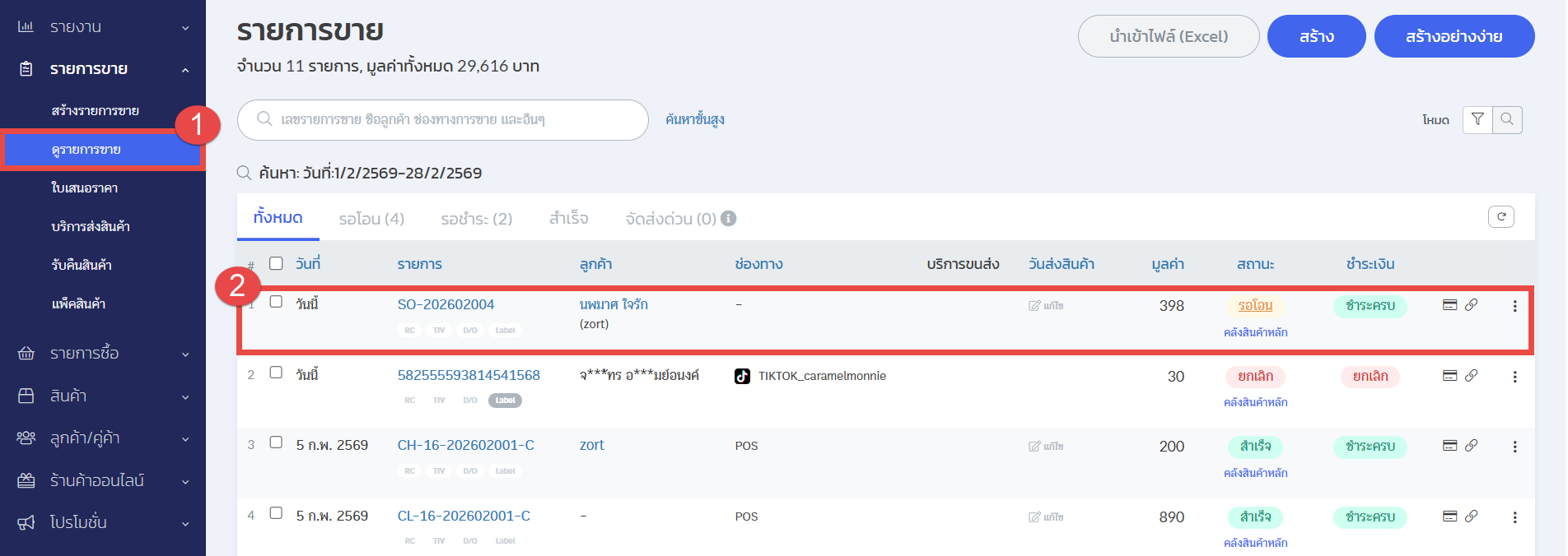 1. ไปที่เมนู “รายการขาย” เลือกหัวข้อ “ดูรายการขาย”