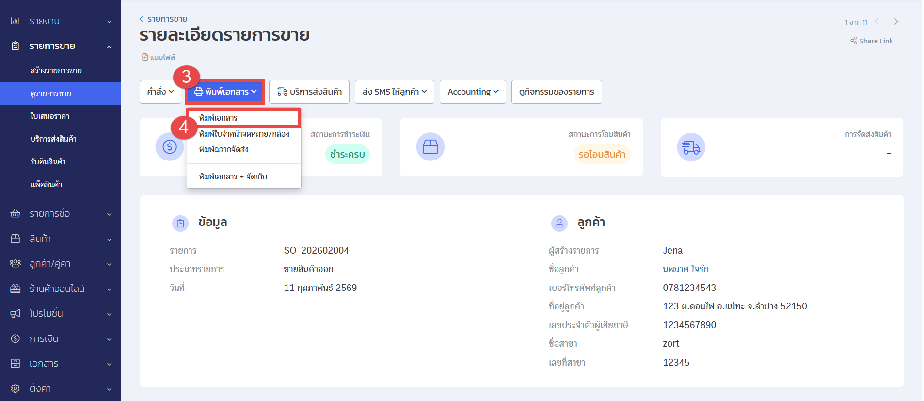 หากทางร้านค้าต้องการพิมพ์ใบกํากับภาษีแบบเต็มรูปแบบที่แสดงข้อมูลในส่วนของ