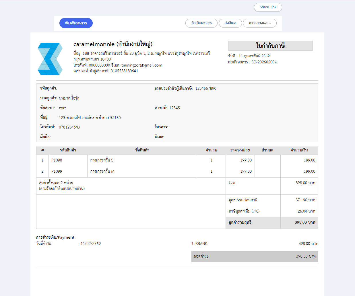 ตัวอย่างใบกำกับภาษีแบบเต็มรูปแบบ