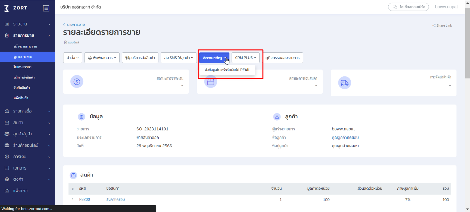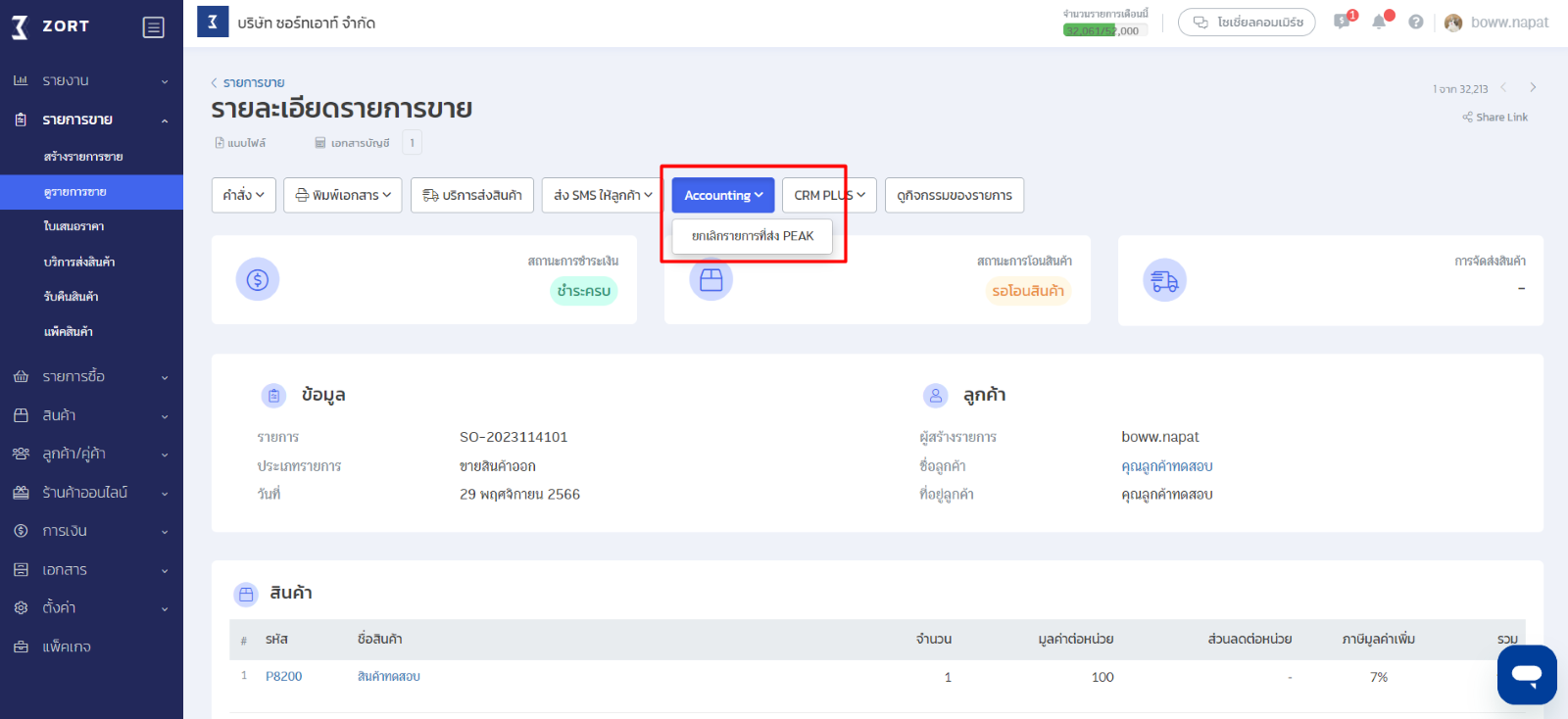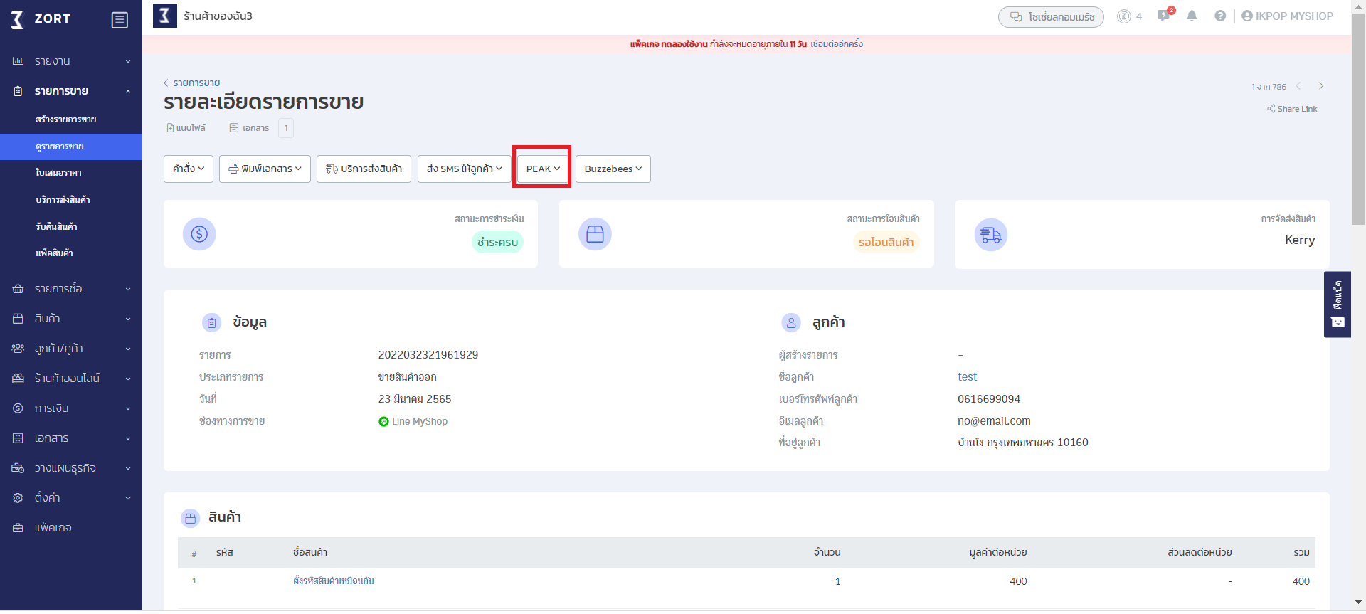 าได้ - เพิ่มปุ่ม “การส่งข้อมูลไประบบบัญชี PEAK” แบบ Manual ที่หน้ารายละเอียดรายการขาย