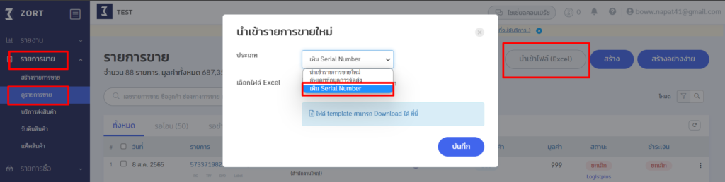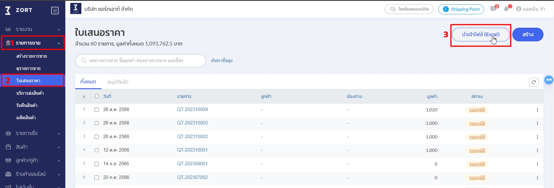 - ไปที่เมนูรายการขาย >> ดูรายการขาย >> เลือกปุ่มนำเข้าไฟล์ (Excel)