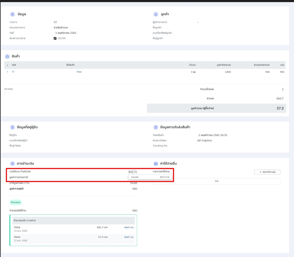 ตัวอย่างออเดอร์จาก Tiktokshop