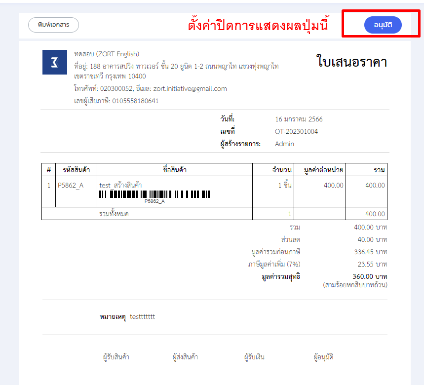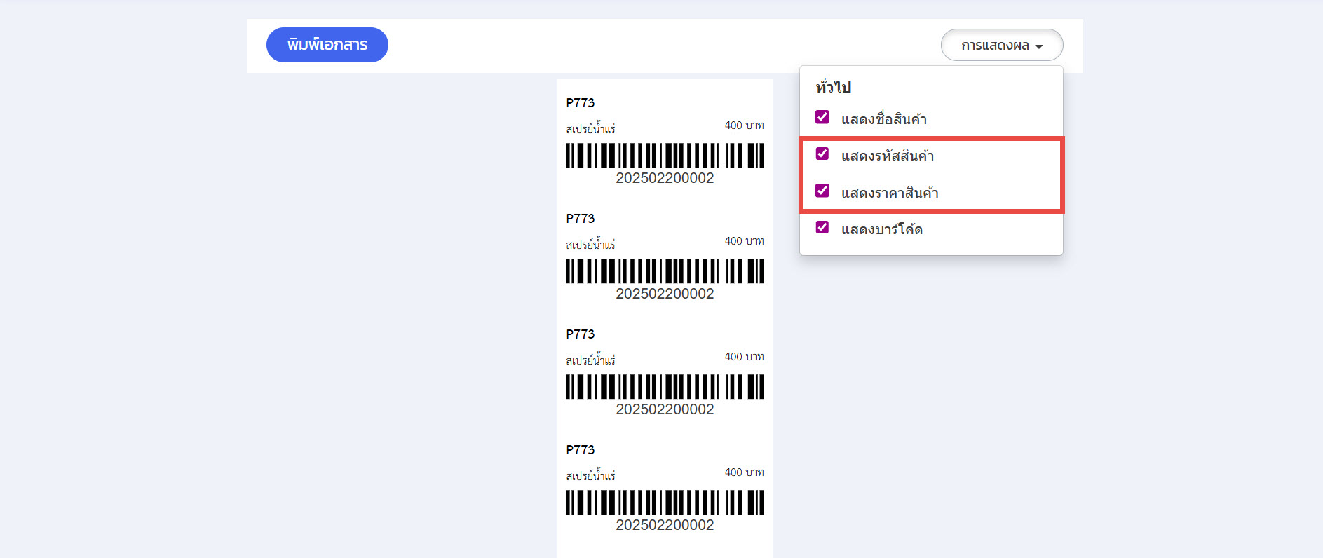 - พิมพ์เอกสาร สติ๊กเกอร์ (5×3 ซม.) เพิ่มการแสดงผลเปิด – ปิดข้อมูลแสดงรหัสสินค้าและราคา