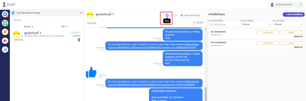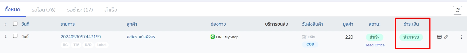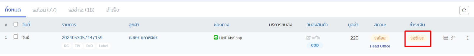 - กรณีข้ามวันไปแล้ว สามารถตรวจสอบออเดอร์ได้ที่แท็บ “ทั้งหมด” หรือ “รอโอน”