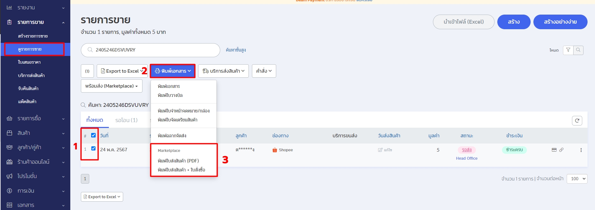 5. การพิมพ์เอกสารส่งมอบพัสดุ สำหรับออเดอร์จาก Marketplace อ่านคู่มือการใช้งาน คลิก