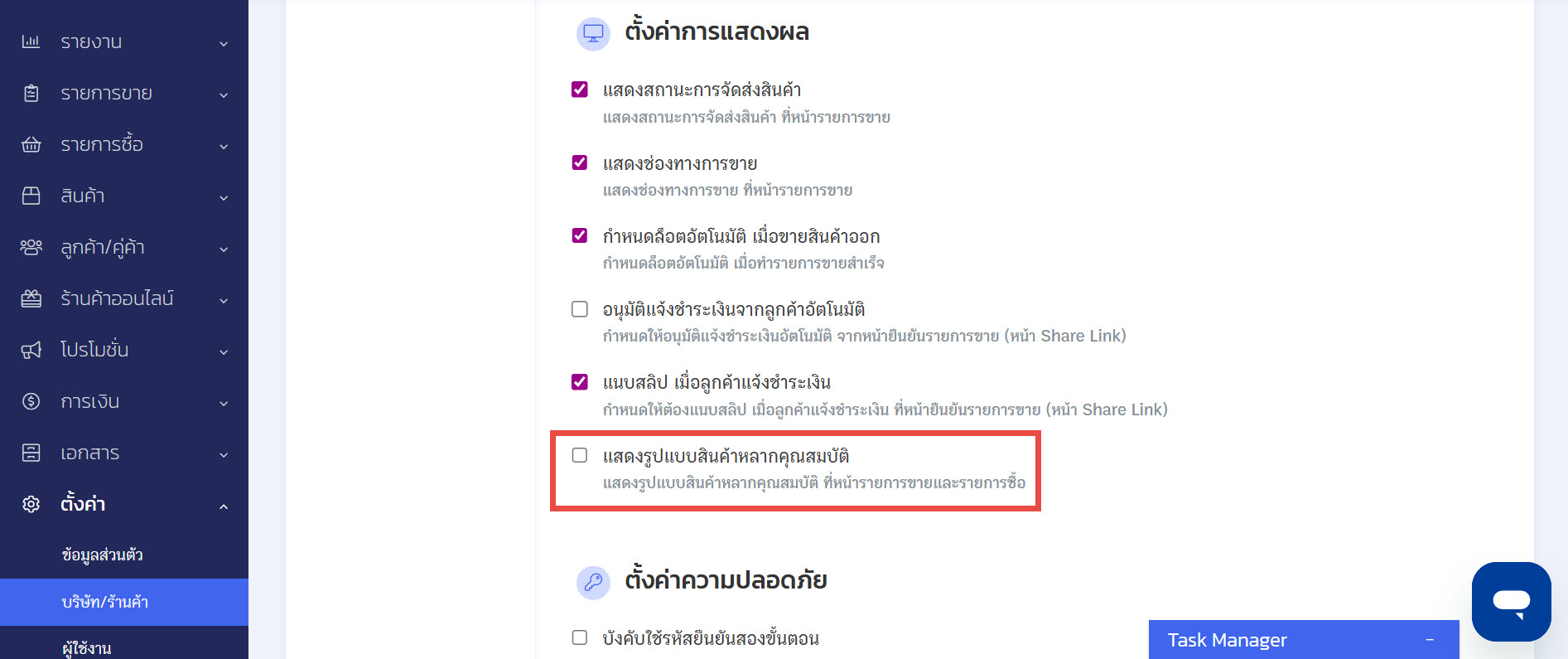 - ตั้งค่าโปรแกรม > เพิ่มข้อความอธิบายใต้ checkbox แสดงรูปแบบสินค้าหลากคุณสมบัติ