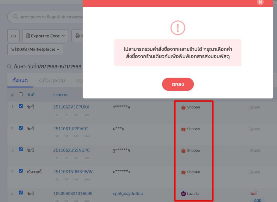 กรณีผู้ใช้งานพิมพ์เอกสารใบยันยันการจัดส่งพร้อมกันทุกร้านค้า ผู้ใช้งานจะไม่สามารถพิมพ์เอกสารได้ และระบบจะแสดงแจ้งเตือนขึ้นมาให้ตามตัวอย่าง