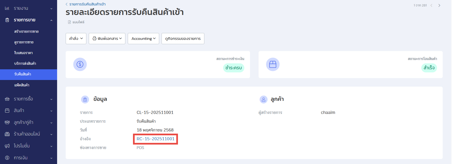 8. รายการคืนสินค้าของ POS แสดงหมายเลขอ้างอิงของรายการต้นทาง อ่านคู่มือการใช้งาน คลิก